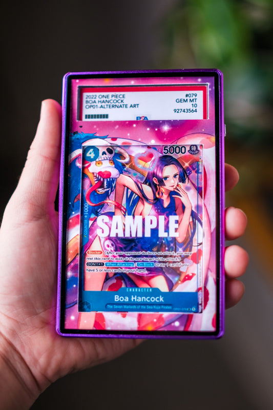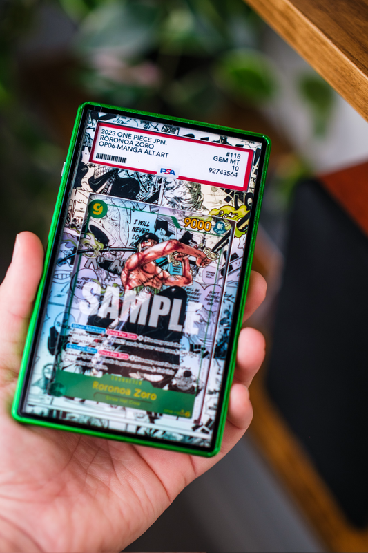Display and protect your graded Pokemon, One Piece and Lorcana slabs with custom extended art display cases! These magnetic displays take your slabs from PSA, BGS and other companies to the next level, allowing you to showcase your favorite cards.